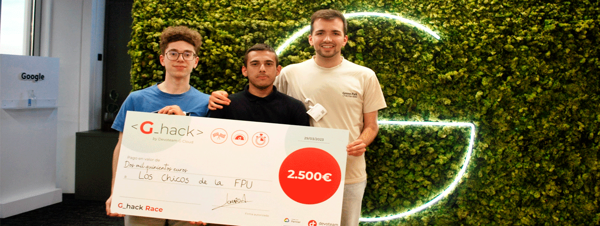 El equipo "Los chicos de la FPU" ha sido nombrado ganador de la competición G Hack Hackathon organizada por Devoteam G Cloud, en las oficinas de Google (Madrid) el 29 de marzo. El equipo, compuesto por los estudiantes de doctorado Juan Carlos Alfaro Jiménez, Guillermo Tomás Fernández Martín y Pablo Torrijos Arenas, se enfrentaron a los siguientes cinco retos relacionados con el desarrollo de soluciones en la nube con tecnología de Google Cloud: Kubernetes y DevOps, Machine Learning, Data, Serverless y Networking. Los tres miembros del equipo son Graduados en Ingeniería Informática por la Escuela Superior de Ingeniería Informática de la Universidad de Castilla-La Mancha. Actualmente, realizan su tesis doctoral en el Grupo de Sistemas Inteligentes y Minería de Datos (I3A), programa de Doctorado en Tecnologías Informáticas Avanzadas (DSI, UCLM). Además, cuentan con una ayuda para la Formación del Profesorado Universitario (FPU). Participan en varios proyectos de investigación competitivos centrados en el desarrollo de algoritmos de aprendizaje automático y explicabilidad.